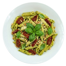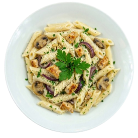 Crème fraîche, champignons de Paris, oignons rouges, ail, poulet mariné.