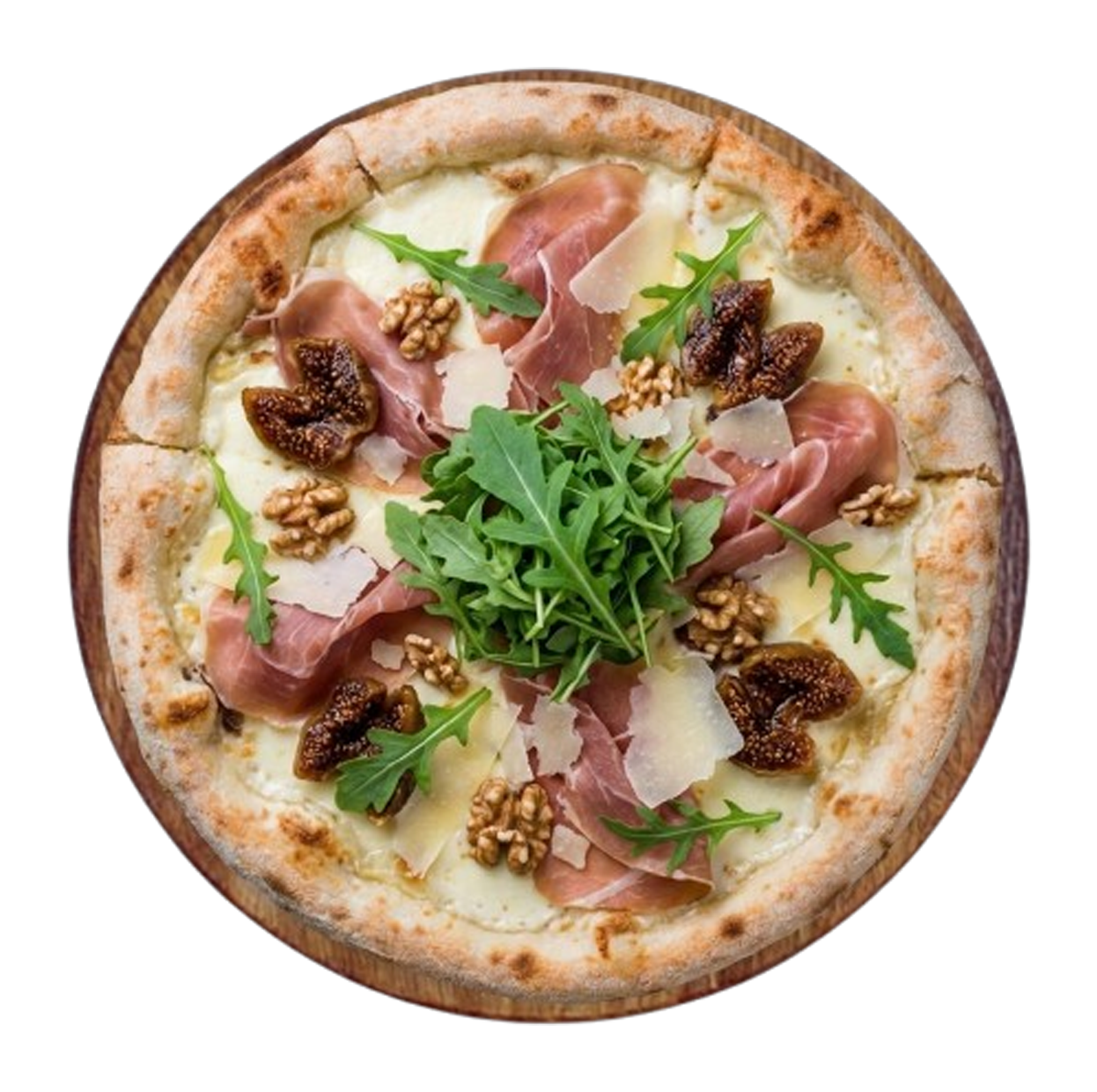 Crème fraîche, mozzarella, jambon, figues séchées, noix, copeaux de parmesan, roquette.