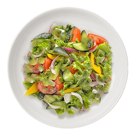 Salade, jambon, maïs, olives, tomates, poivrons.