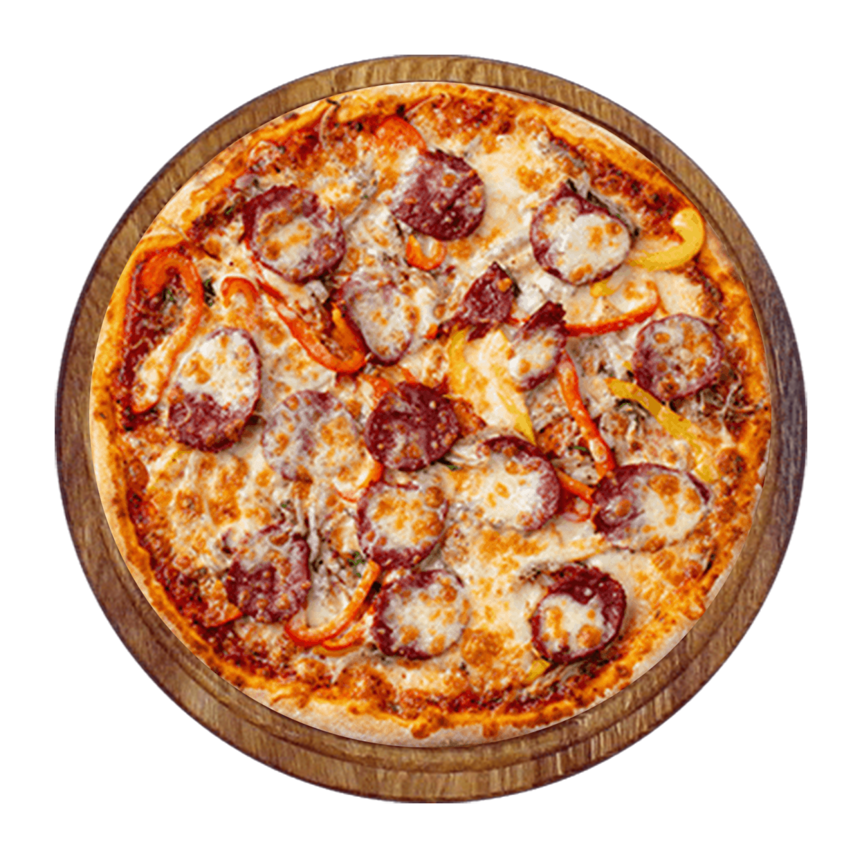 Sauce tomate, mozzarella, pepperoni, merguez, poivrons, olives.